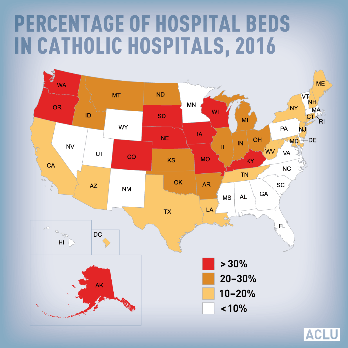 DETROIT – The American Civil Liberties Union and MergerWatch today released reports that reveal that one in six hospital beds in the United States is in a facility that complies with the Catholic Directives that prohibit a range of health care services even when a woman’s life or health is in jeopardy. In some states, more than 40 percent of all hospital beds are in a Catholic facility, leaving entire regions without any option for certain reproductive health care. The ACLU’s report shares firsthand accounts from patients who have been denied appropriate care at Catholic hospitals, from health care providers forbidden from providing critical care because of the Directives, and from physicians at secular hospitals who have treated very sick women after they were turned away from a Catholic facility.